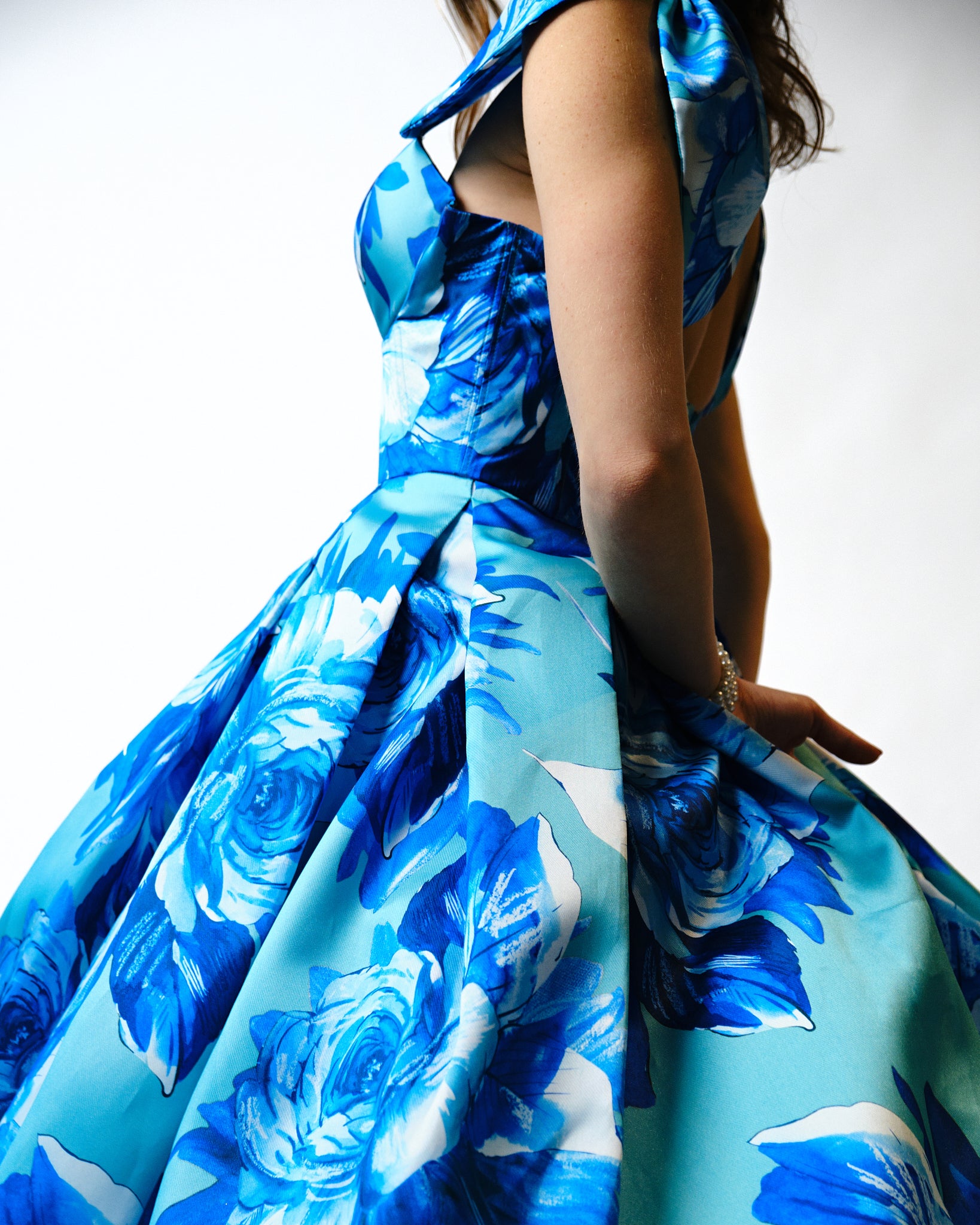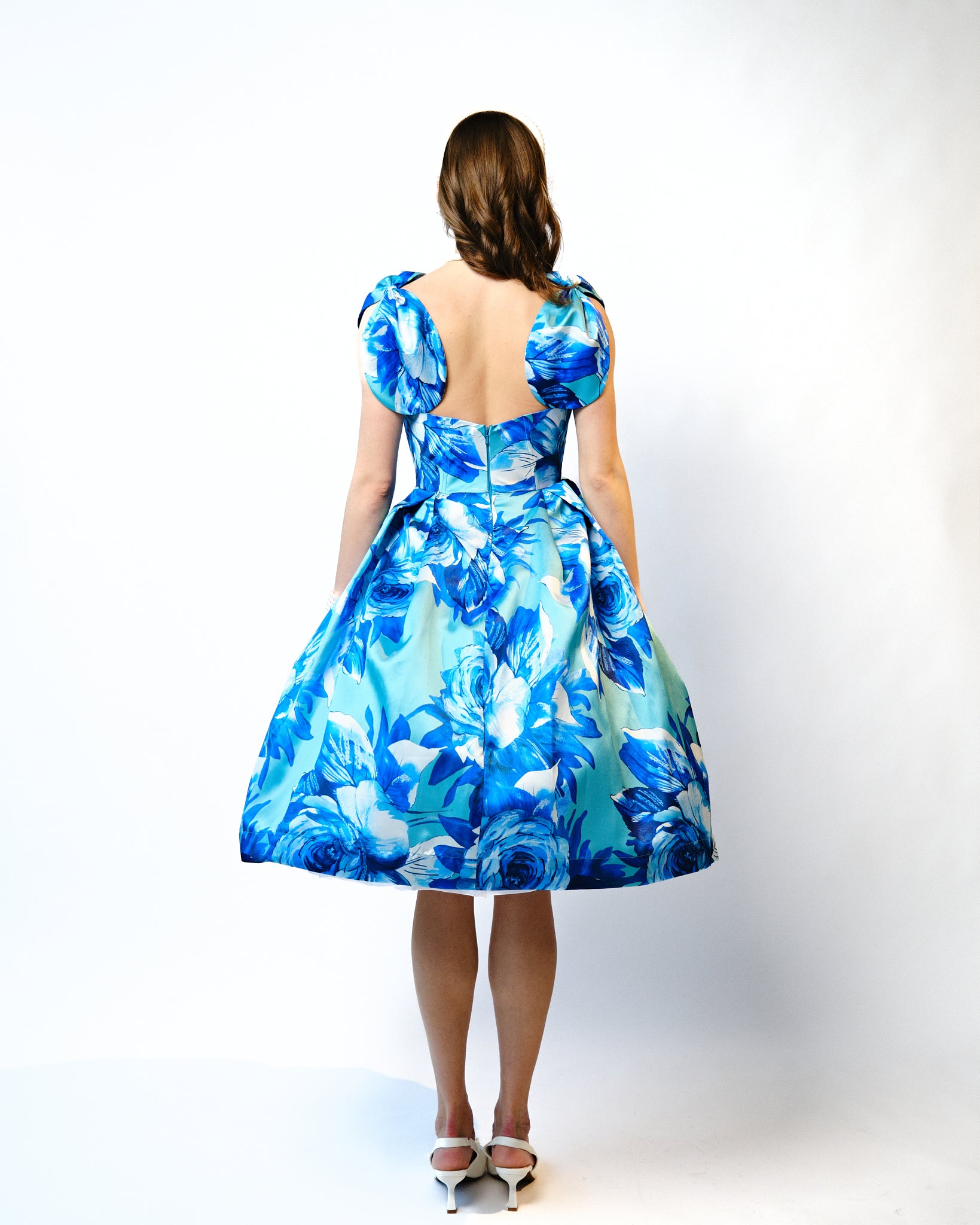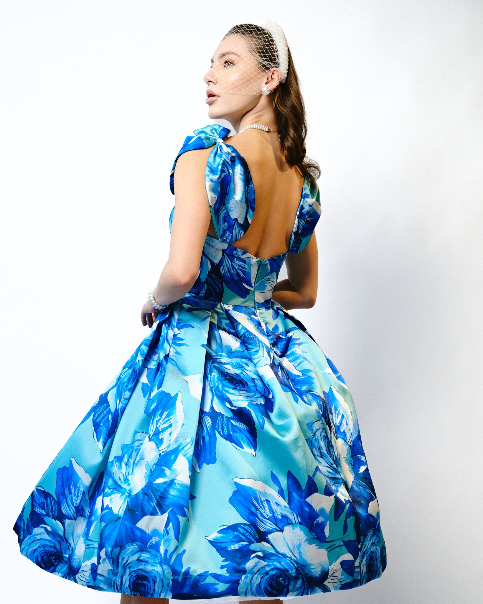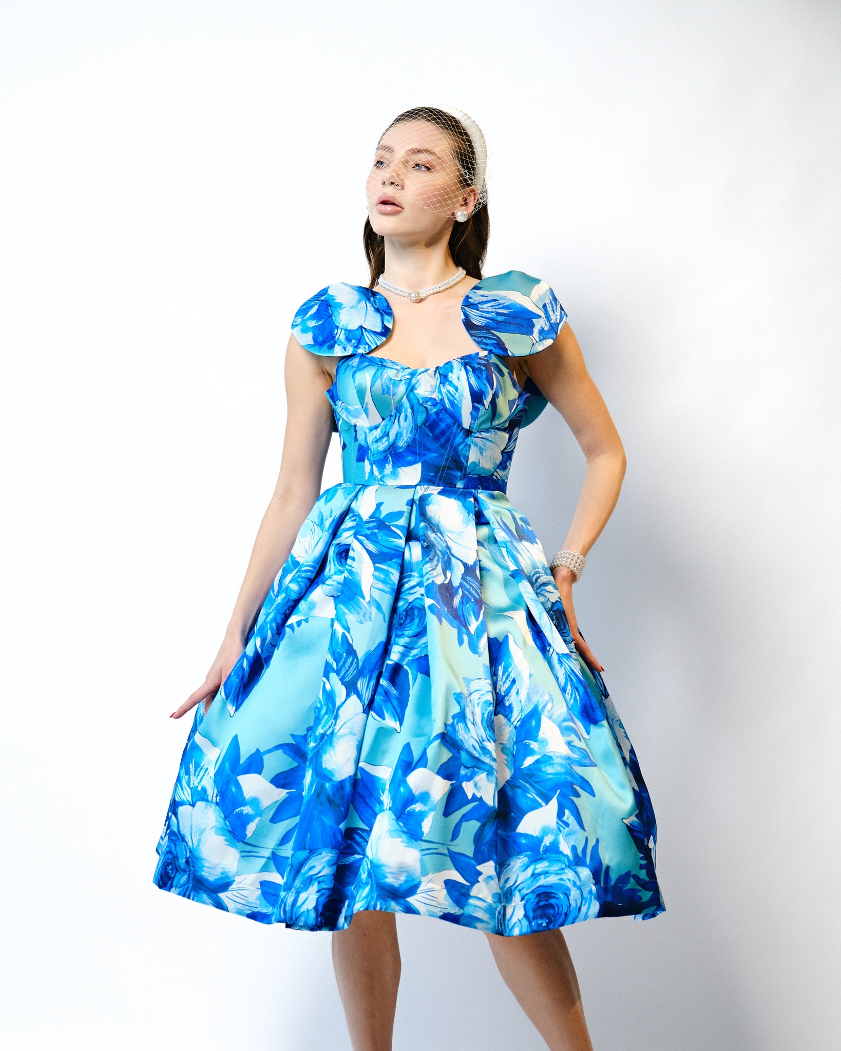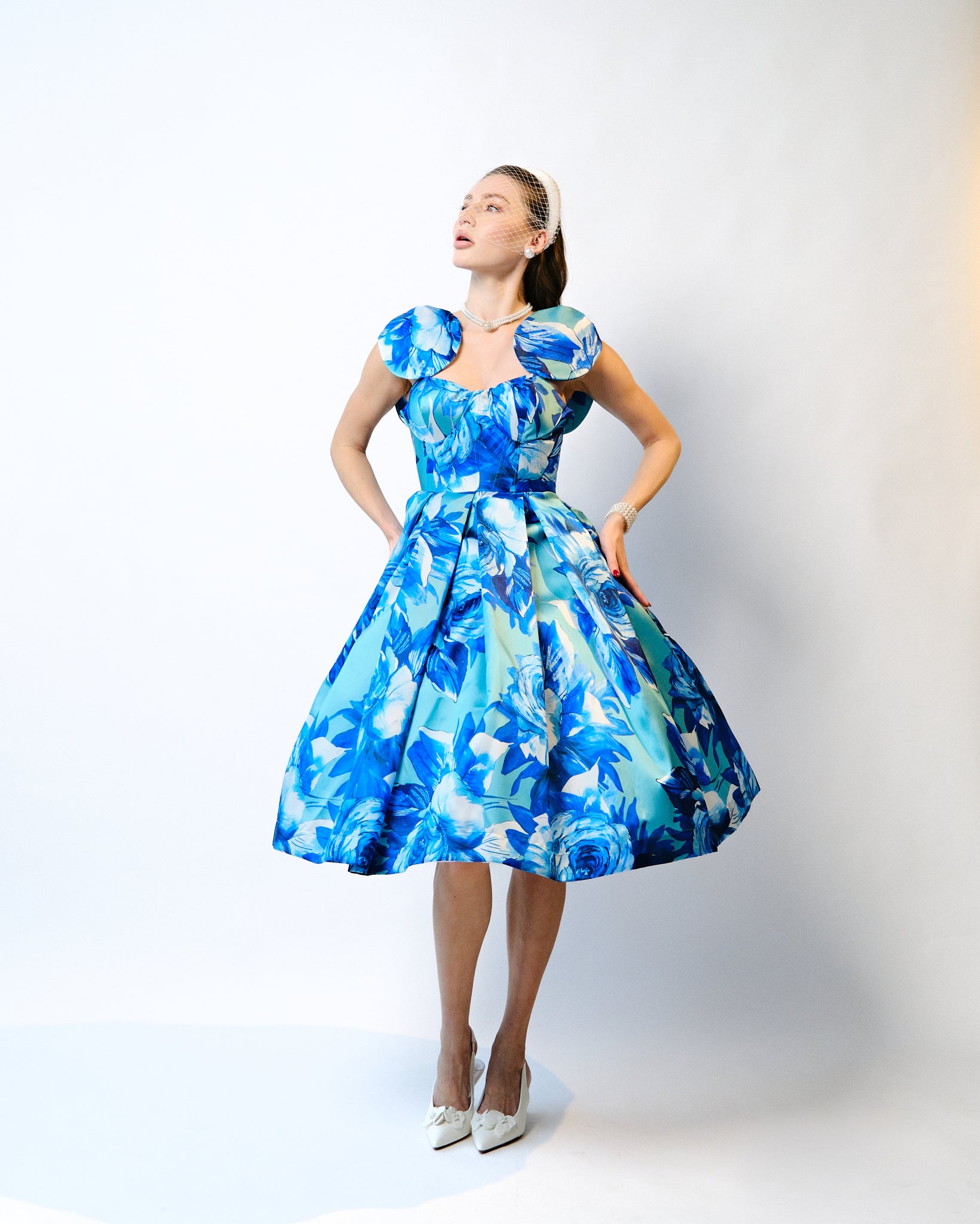 This dress is a stunning vintage-inspired piece reminiscent of 1950s fashion. It features a vibrant blue floral print on a flowing, voluminous skirt that adds a touch of elegance and femininity. The bodice is fitted with delicate ruffled cap sleeves and a sweetheart neckline, enhancing its timeless charm. Made from lightweight, silky fabric, the dress moves gracefully, making it perfect for sophisticated occasions. Paired with classic white heels and subtle accessories, this ensemble exudes a refined yet bold aesthetic.
