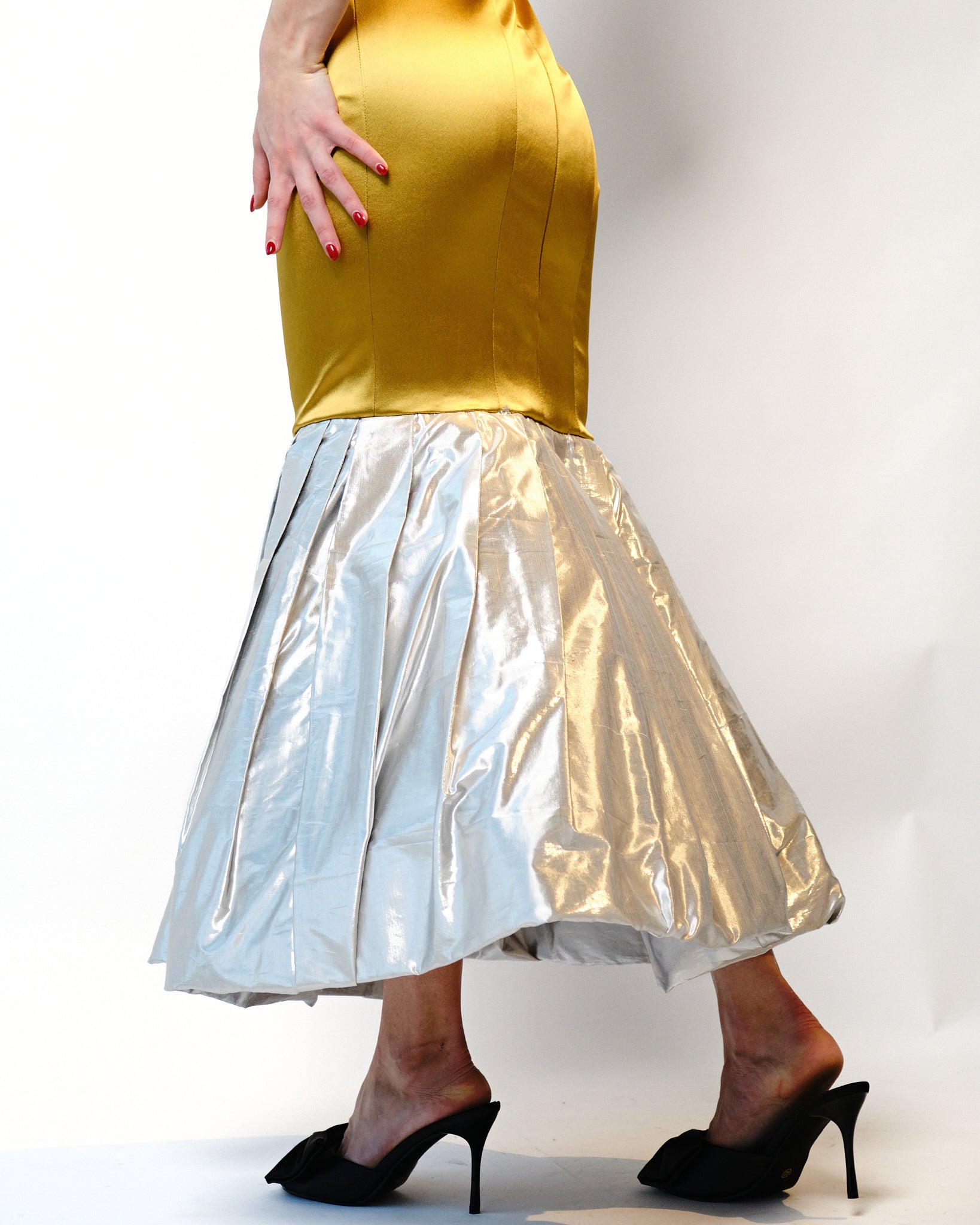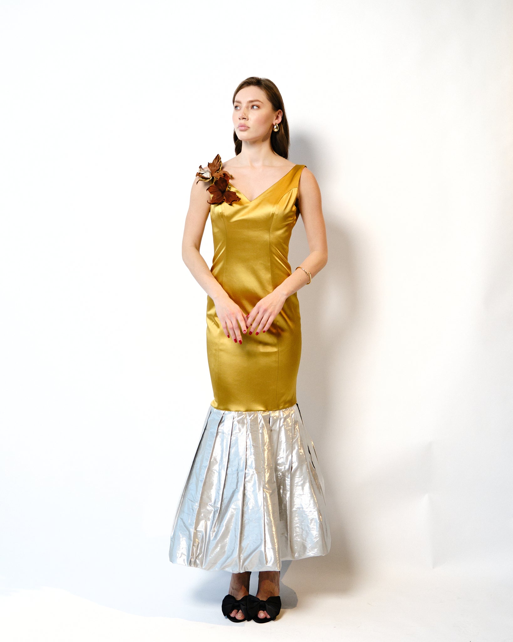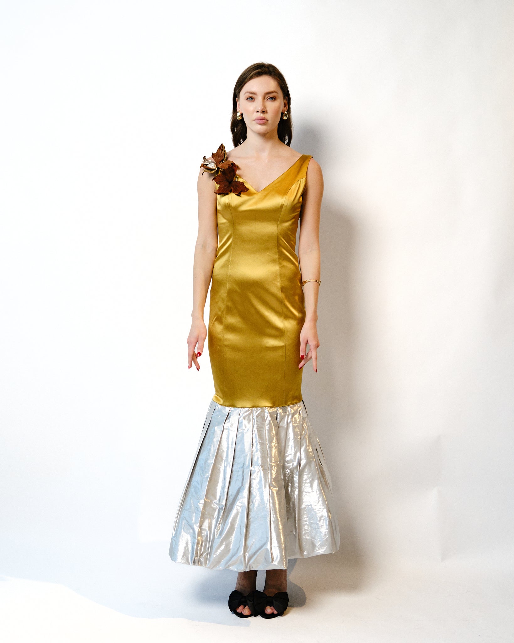 Gold Satin mermaid dress with silver pleated hem and floral shoulder detail
