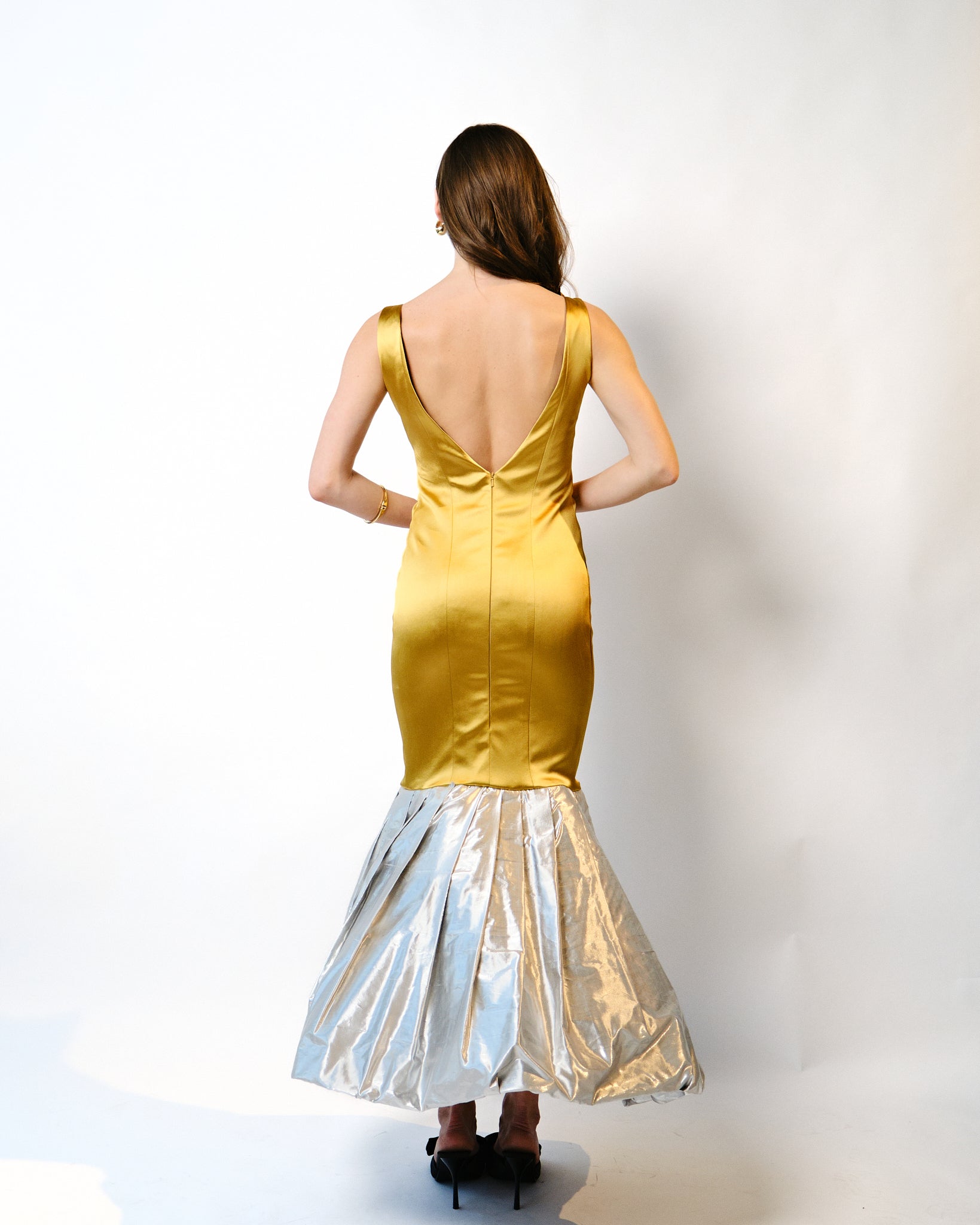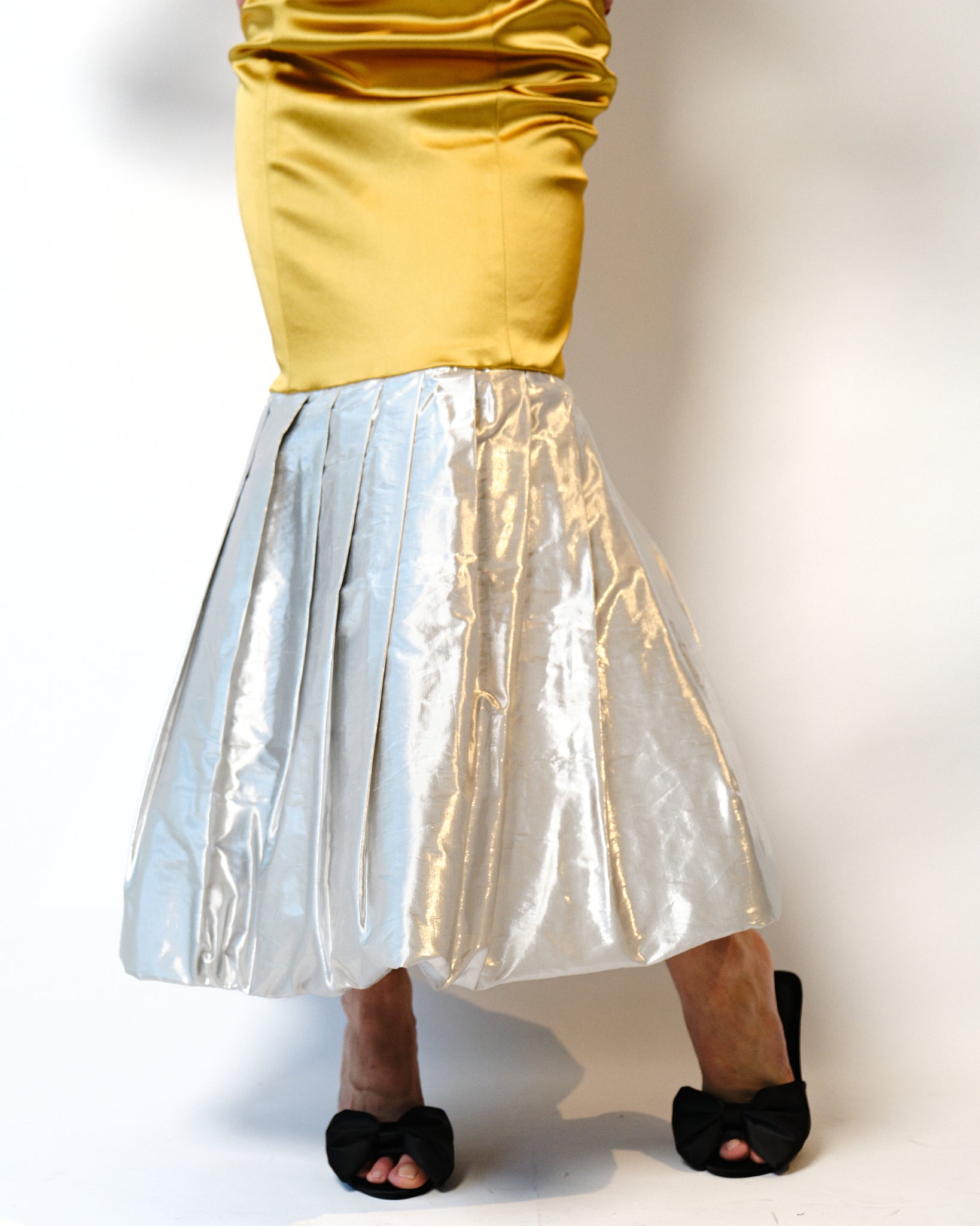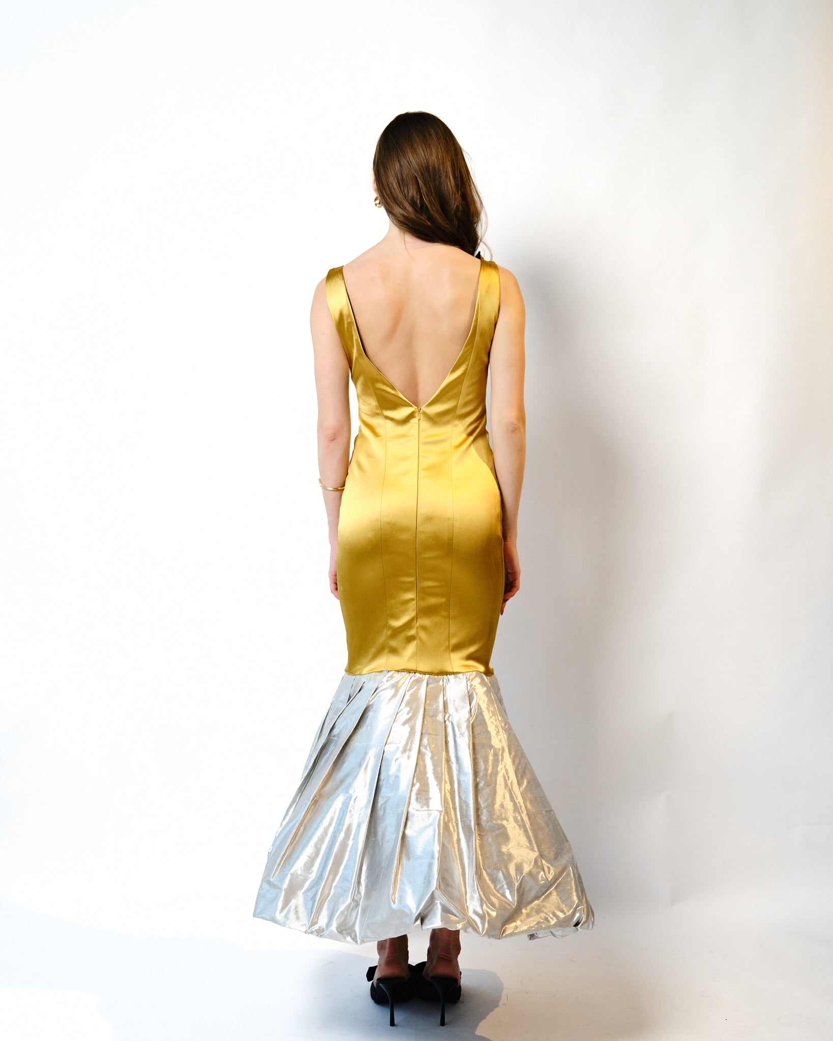 Gold Satin mermaid dress with silver pleated hem and floral shoulder detail